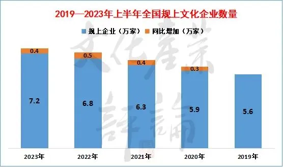 据国家统计局最新数据,2023年上半年,全国规模以上文化企业增至7.2万家。文化产业评论(ID:whcypl)梳理近4年同期企业数据发现,我国规模以上文化企业由2019年上半年5.6万家,增加到2023年同期的7.2万家,4年同期累计升规入统1.2万家,每年同期平均新增4000多家规上企业,文化市场主体得到了持续发展壮大。