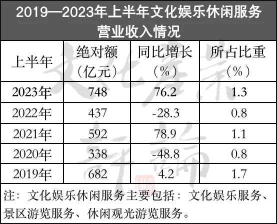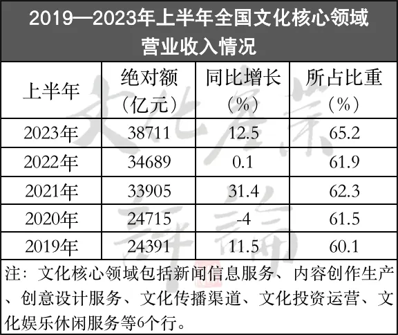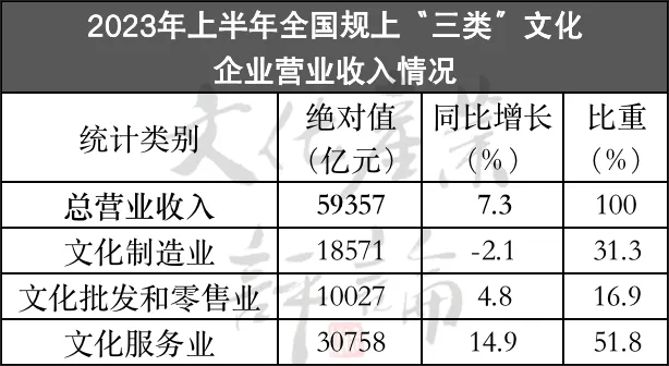三是文化服务业增速明显。上半年,文化服务业实现营业收入30758亿元,超越了文化制造业(18571亿元)和文化批发和零售业(10027亿元)同期收入的总和,比2022年同期增长了14.9%。同时,营业收入占全部营业收入的比重升至51.8%,占比高于去年同期5个百分点,高于2019年同期10个百分点,创造了近5年来历史最邓水平。