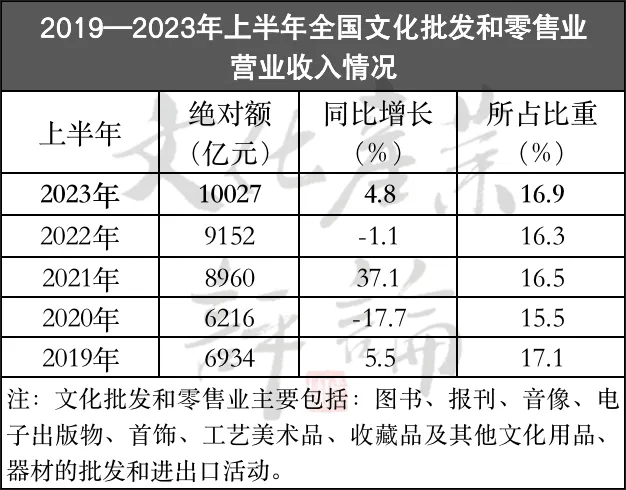 二是批发零售业趋于乐观。2023年上半年,全国文化批发和零售业10027亿元,比去年同期增长4.8%,所占比重为16.9%。其中,营业收入较2019年同期(6934亿元)增加了3093亿元,所占比重为疫后4年同期最好水平,接近于2019年同期该产业所占比重(17.1%)。横向对比来看,2023年文化批发和零售业恢复趋于乐观。