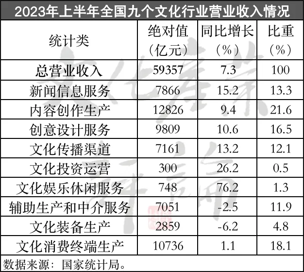 根据国家统计局发布的《2023年上半年全国规模以上文化及相关产业企业数据》,在上半年全国9个文化行业中(详见下表),新闻信息服务、内容创作生产、创意设计服务、文化传播渠道、文化娱乐休闲服务等7个行业,保持了稳中向好的增长态势。辅助生产和中介服务和文化装备生产2个行业,再次出现了连续两年负增长,不利因素与文化制造业和文化相关领域基本一致。
