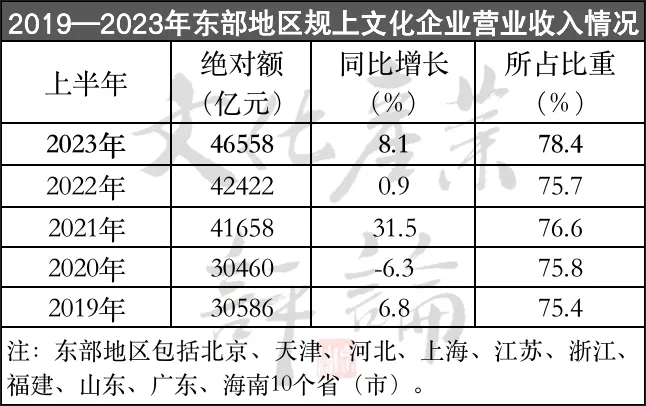 一是东部比重高达七成。从东部地区来看,2023年上半年,东部地区实现营业收入46558亿元,比上年同期增长8.1%;所占比重为78.4%,比去年同期增长2.7个百分点,占全国文化企业总营业额的近八成,创下5年来的同期最好水平。其中,一季度东部地区实现营业收入22320亿元,比上年同期增长4.6%,全国所占比重77.5%。其中,广东省为4841.6亿元、北京市为4541.7亿元,占东部地区四成之多。