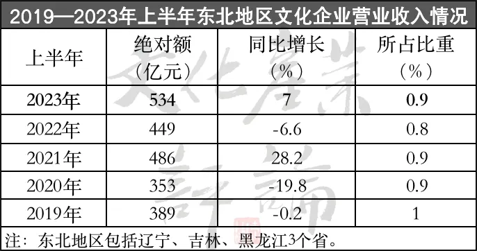 三是东北地区上下起浮不大。与中西地区相比,东北地区规上文化企业主体较弱小,文化产业营业收入横向可比性不强。但从近5年来发展现状对比可以看出,东北地区文化产业发展成效还是比较明显。今年上半年,东北地区实现营业收入为534亿元,比去年同期增长了7.0%,增速超过2019年的同期6.8个百分点。而占全国营业收入份额仍未有突破性跃升。