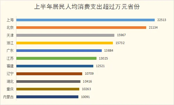 其中,北京人均消费支出突破2万元,湖北、重庆、内蒙古人均消费支出突破1万元,使得今年上半年人均消费支出突破1万元的地区比去年同期增加了3个。