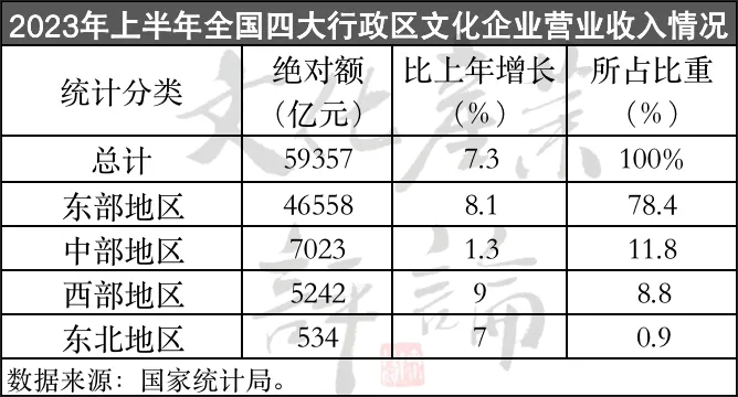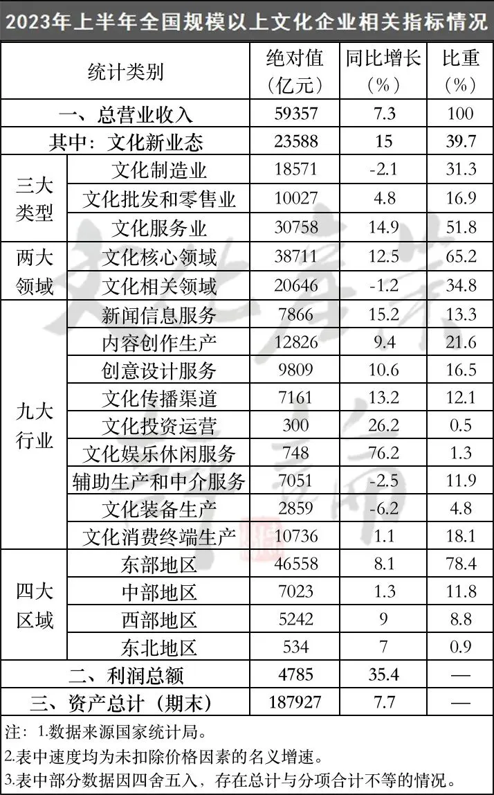 7月30日,国家统计局发布文化产业统计数据显示,据对全国7.2万家规上文化企业调查,2023年上半年,全国规上文化企业实现营业收入59357亿元,比上年同期增长7.3%。其中,二季度营业收入同比增长达到10.7%,自2021年三季度以来首次实现单季两位数增长。