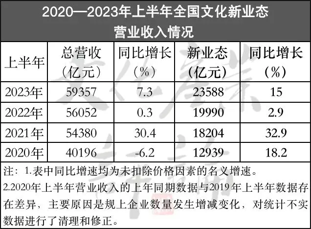 自2020年起,为加强文化新兴行业的统计监测,国家统计局将互联网文化企业、动漫和游戏企业及智能文化设备制造等新业态特征明显的16个行业小类纳入统计范畴。从4年来同期数据对比看,2023年上半年新业态营业收入比去年同期增加3598亿元,较2020年同期增加1.1万亿;4年同期累计增长69%,年均增长17.25%,断崖式领跑全部文化企业同期增速。