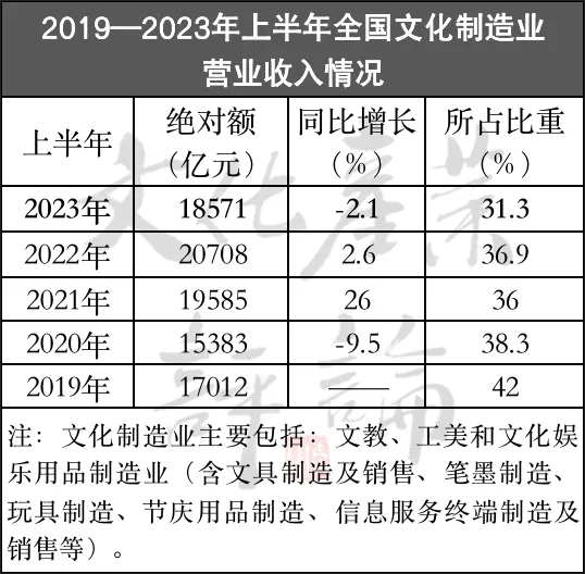 一是文化制造业出现乏力。2023年上半年,全国文化制造业营业收入比去年同期(2.6%)下降2.1%,占全部企业营业收入比重较去年同期(2022年比重为36.9%)减少了5.6个百分点。其中,营业收入同比增长均低于2021年和2022年同期水平,所占总营业收入的比重,均低于近5年来的同期增长水平(详见下表)。其主要原因是,传统文教、工美和文化娱乐用品制造业乏力所致。