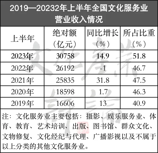 三是文化服务业增速明显。上半年,文化服务业实现营业收入30758亿元,超越了文化制造业(18571亿元)和文化批发和零售业(10027亿元)同期收入的总和,比2022年同期增长了14.9%。同时,营业收入占全部营业收入的比重升至51.8%,占比高于去年同期5个百分点,高于2019年同期10个百分点,创造了近5年来历史最邓水平。