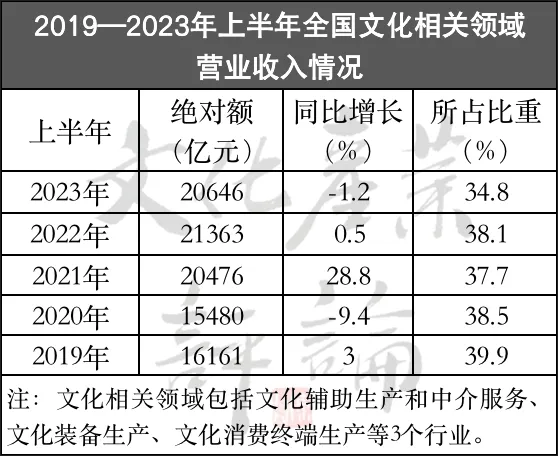 相比文化核心领域高歌奋进,今年上半年全国文化相关领域营业收入为20646亿元,比去年同期下降了1.2%,所占全部营业收入的比重同比下降3.3个百分点,3项关键指标均低于去年同期。其中,营业收入所占比重跌至2020年以来的同期最低点。导致这些结果的主要因素是,去年以来文化装备生产、文化消费终端生产等行业市场需求放缓。