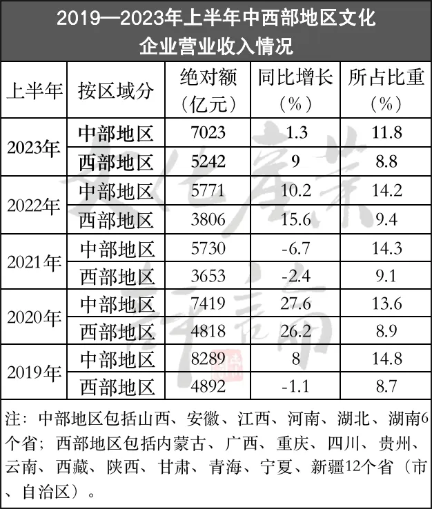 二是西部增速快于中部。据国家统计局数据显示,今年上半年,中部地区文化企业营业收入为7023亿元,同比增长1.3%;西部地区为5242亿元,同比增长9.0%,高出中部地区同期增速7.7个百分点。虽然西部地区营业收入总额和所占比重(11.8%)低于中部地区,但其增长的势头不容小觑。明年或十四五期间,稍有不甚可能就面临被超越的危机。