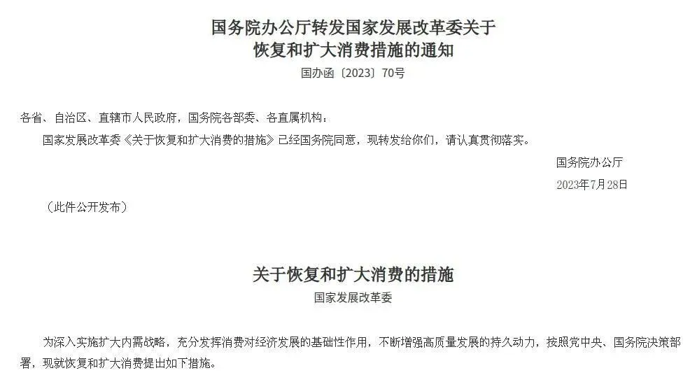 1.国务院办公厅转发国家发展改革委《关于恢复和扩大消费的措施》。