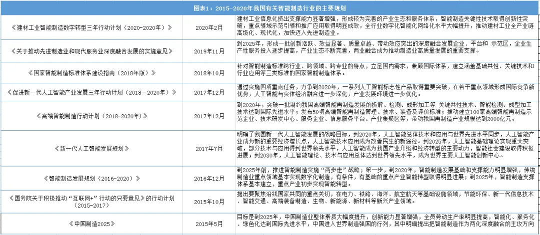 由于工业制造业在国民经济中有着重要地位,因此我国对于工业制造也非常重视。截至2019年底,我国基本跨越“工业2.0”(电气化),开始进入工业互联化阶段,我国开始建设工厂物联网、服务网、数据网、工厂间互联网,工业装备逐渐实现集成。同时我国近年来也发布多项政策推动我国工业智能化的发展,特别是我国颁布的《中国制造2025》,为我国“工业4.0”的发展奠定了基础。