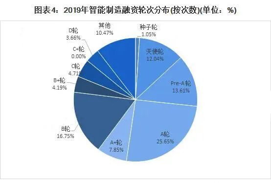 融资轮次方面,由于我国在智能制造方面还属于初级阶段,各种技术还不成熟,因此我国在智能制造领域的企业大多都还处于初创阶段,由此在融资方面也为A轮之前较多。2019年,我国智能制造A轮前融资事件大约占据了当年总融资次数的50%多,其中A轮融资事件发生49次,占比25.65%;融资金额74.74亿,占行业总融资比例为8.92%,A轮前后融资额(A轮、Pre-A轮、A+轮)占总融资额的14.83%。