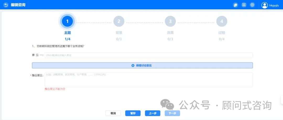 5)说明进行此项管理改进的微观背景、中观背景和宏观背景。每项问题填写完成整合意见后点击【下一步】即可。完成背景部分3项内容后点击【下一步】,会进入效果部分。