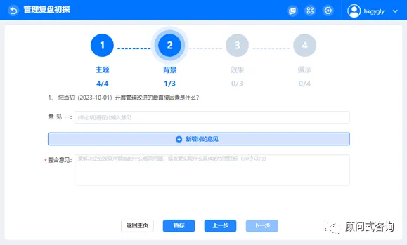 3)管理复盘实战包括主题、背景、效果、做法四部分内容,依次回答相关问题。系统支持头脑风暴工作方式,即多个团队成员分别独立发表意见,然后整合归一,同时保留讨论过程。意见条数可自行新增,过程意见非必填项,整合意见为必填项。