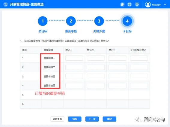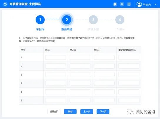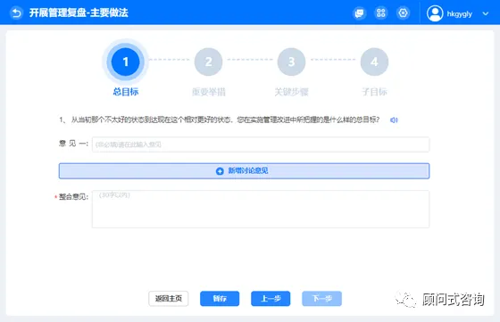 8)开展管理复盘的主要做法,首先进入总目标讨论,说明当初管理改进项目的总体期望。完成整合意见后点击【下一步】即可进入重要举措填写页面。