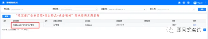 12)在讨论做法中可随时点击【暂存】,保存做法中的讨论意见。确认所有子目标的整合意见后,点击【确定】保存当前版本。同步形成本次管理复盘主题,组成规则为:适宜推广企业类型+突出特点+“的”+业务领域。