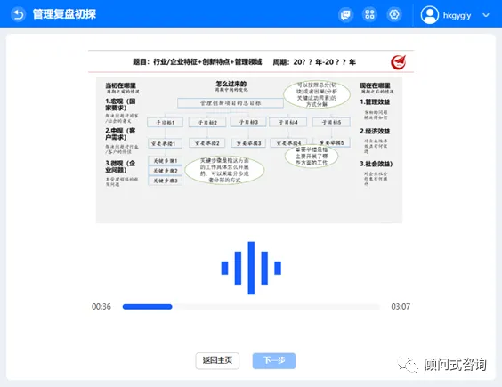 2)在管理复盘实战主页,点击【新增】,进入“管理复盘初探”页面,系统自动进行音频播放,说明本环节操作要领。需待音频播放完成后,才可点击【下一步】进入实战页面。若要退出,可点击【返回主页】。