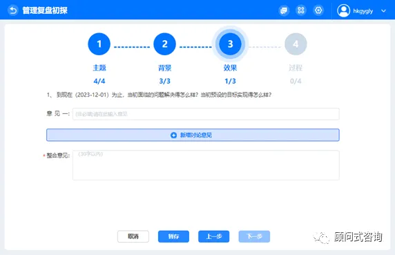 3)管理复盘实战包括主题、背景、效果、做法四部分内容,依次回答相关问题。系统支持头脑风暴工作方式,即多个团队成员分别独立发表意见,然后整合归一,同时保留讨论过程。意见条数可自行新增,过程意见非必填项,整合意见为必填项。