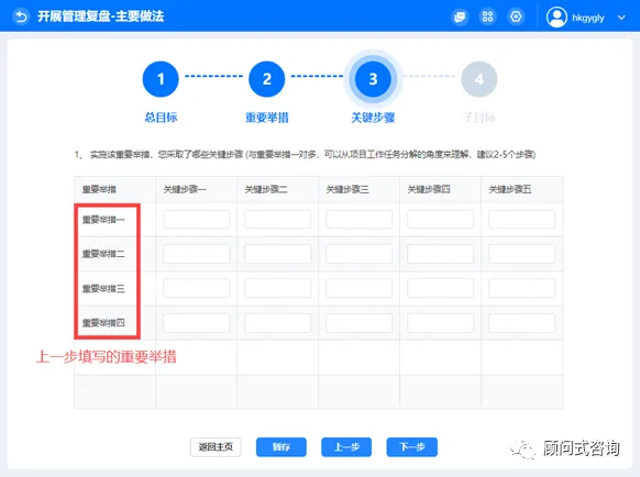 10)进入关键步骤讨论,要注意所有关键步骤都是对应于某一个重要举措,具体说明这方面工作是如何开展的。最多可填写5项内容。完成后点击【下一步】即可进入子目标页面。