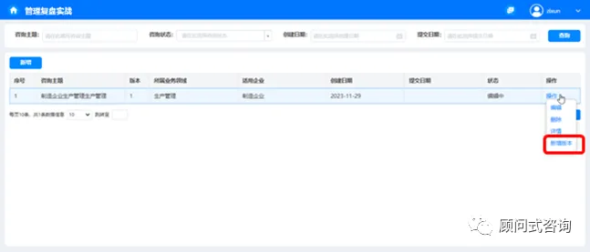 在管理复盘入门主界面,按主题选择项目,从最右端的操作列点击【新增版本】,进入管理复盘进阶页面,将以框架方式展示入门阶段的工作结果。