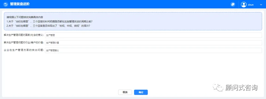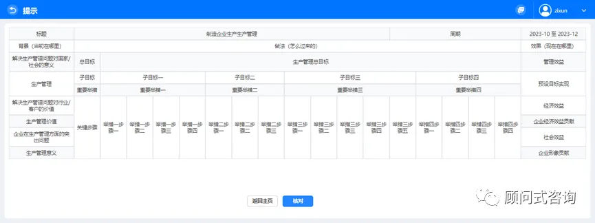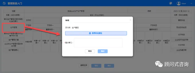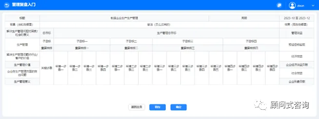 8)开展管理复盘的主要做法,首先进入总目标讨论,说明当初管理改进项目的总体期望。完成整合意见后点击【下一步】即可进入重要举措填写页面。