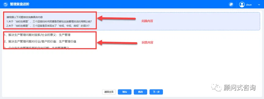 1)点击【核对】,进入管理复盘进阶讨论过程。依据系统引导,逐一确认相关内容修改到位(文字表达符合自己当前的管理认知)。点击【修改】按钮,页面变换为可编辑状态,修改完成后点击页面任一位置退出编辑状态并保存修改后的内容,点击【下一步】则进入下一问题页面。