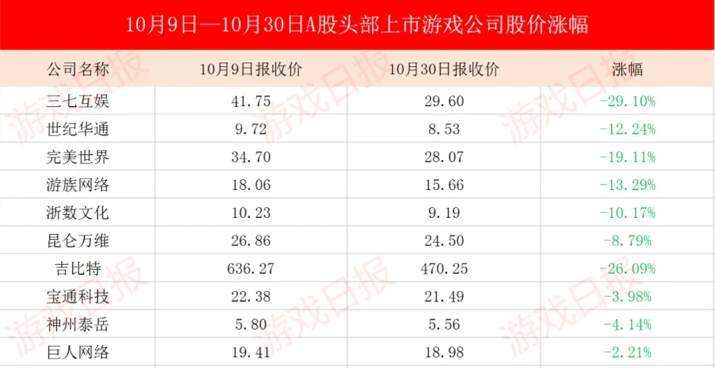 近日,游戏日报整理了自10月9日以来,A股上市游戏公司半年营收Top10的股价涨幅情况,发现十家公司无一例外出现下跌。