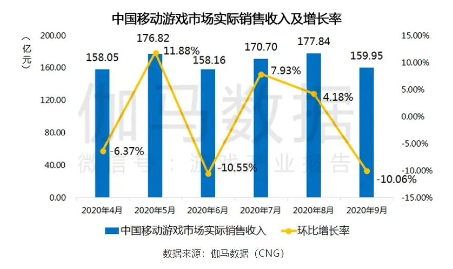 后来,随着人们的生活已基本回归正常,以及9月开学季的影响,游戏市场的增速也有所放缓。根据游戏工委Q3产业报告,中国游戏市场收入环比增长仅有3.37%,单季营收不及Q1,或多或少也给外界造成了旺季不旺的印象。而伽马数据的报告则显示,今年9月中国移动游戏市场实际销售环比下降了10.06%。