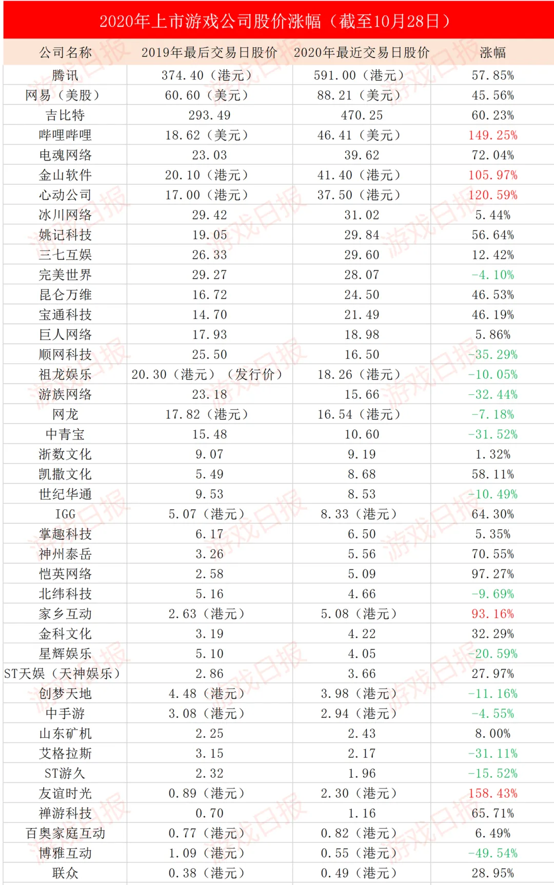 各项数据增速的放缓,以及Q4淡季的来临,也让投资者逐渐回归理性。而从游戏日报统计的40家上市游戏公司2020年前十个月股价涨幅来看,虽然游戏概念股已经经历了一轮大跌,但截至目前,仍旧有一半以上的股价高于去年。且有五家公司股价涨幅超100%(其中友谊实况报名了金口奖2020年度游戏公司),四家公司股价增值100元以上。
