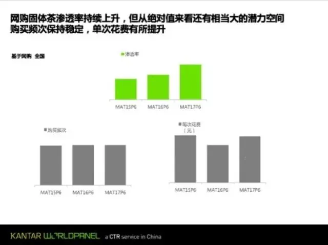 例如,在购买渠道结构变动方面,赵晖表示,在以实体渠道的主导地位不变的情况下,茶业电商呈现持续高歌猛进态势,越来越多的消费者选择网络进行消费,网购渠道的重要性日益凸显。由此带来电商渗透率的持续上升,但从绝对值来看,还有相当大的潜力空间。