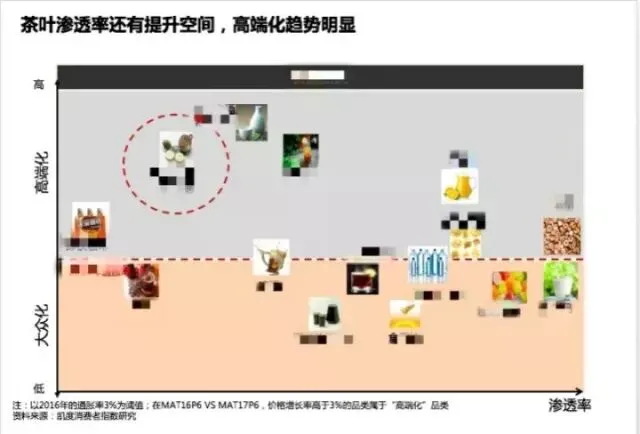 另一边,通过凯度数据分析表示,从消费端出发,对高品质生活的持续追求带来茶叶消费升级。目前,整体茶叶规模所呈现出的同比小幅上涨,也主要源于品类高端化的带动所致,高端化趋势明显。