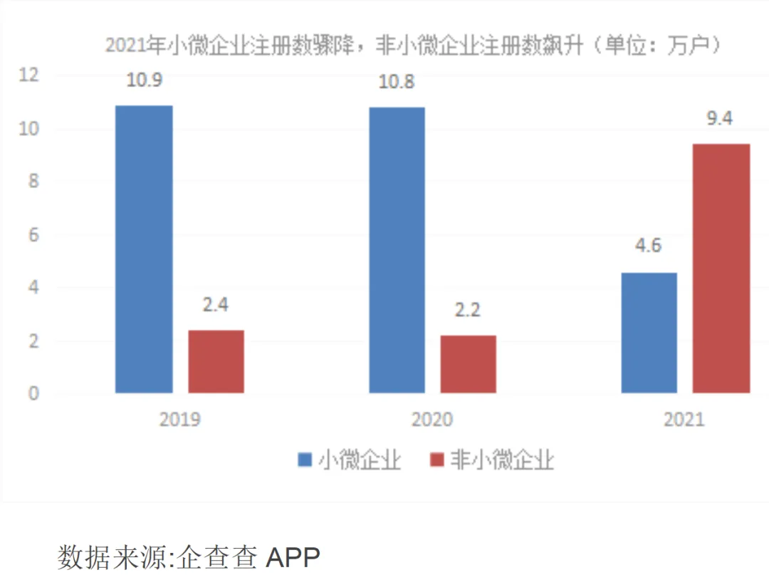 截至2021年12月28日,从全市小微企业新注册情况看,2019年11万户、2020年稍有下降10.9万户、2021年骤降至4.6万户;相比之下,非小微企业(除个体工商户)2019年新注册2.4万户、2020年2.3万户、2021年大幅上升至9.6万户。可以看出,疫情之下,没有一个市场主体能够幸免,2020年,小微企业和非小微企业注册数均出现下降,但在2021年却出现了截然相反的一幕,在多项纾困政策扶持下,小微企业仍未完全走出疫情的阴霾。
