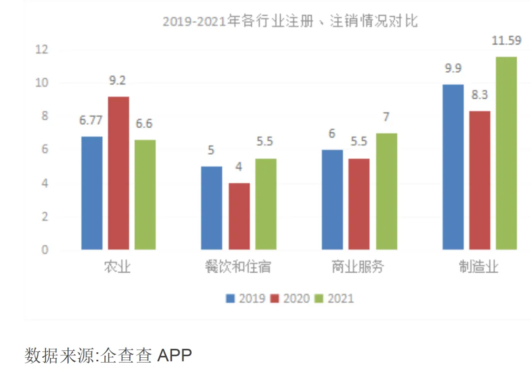 为进一步解答活跃度问题,我们引入了“注册注销比”,即规定时间内的企业注册数量比注销数量,从行业角度进行微观比较。显而易见,在不考虑样本量的情况下,该比值越高,行业形势向好,比值越低,行业趋冷。管中窥豹,可见一斑,数据显示与经验判断趋势一致。从时间维度看,2020年新冠疫情影响,二、三产业注销比均出现了下降,农业产业出现上升(除第一产业受疫情影响较小外,也存在样本量较小的原因),正如清华大学魏杰教授提出的三重压力,需求收缩首当其冲,新冠病毒直接导致了第三产业的需求收缩。