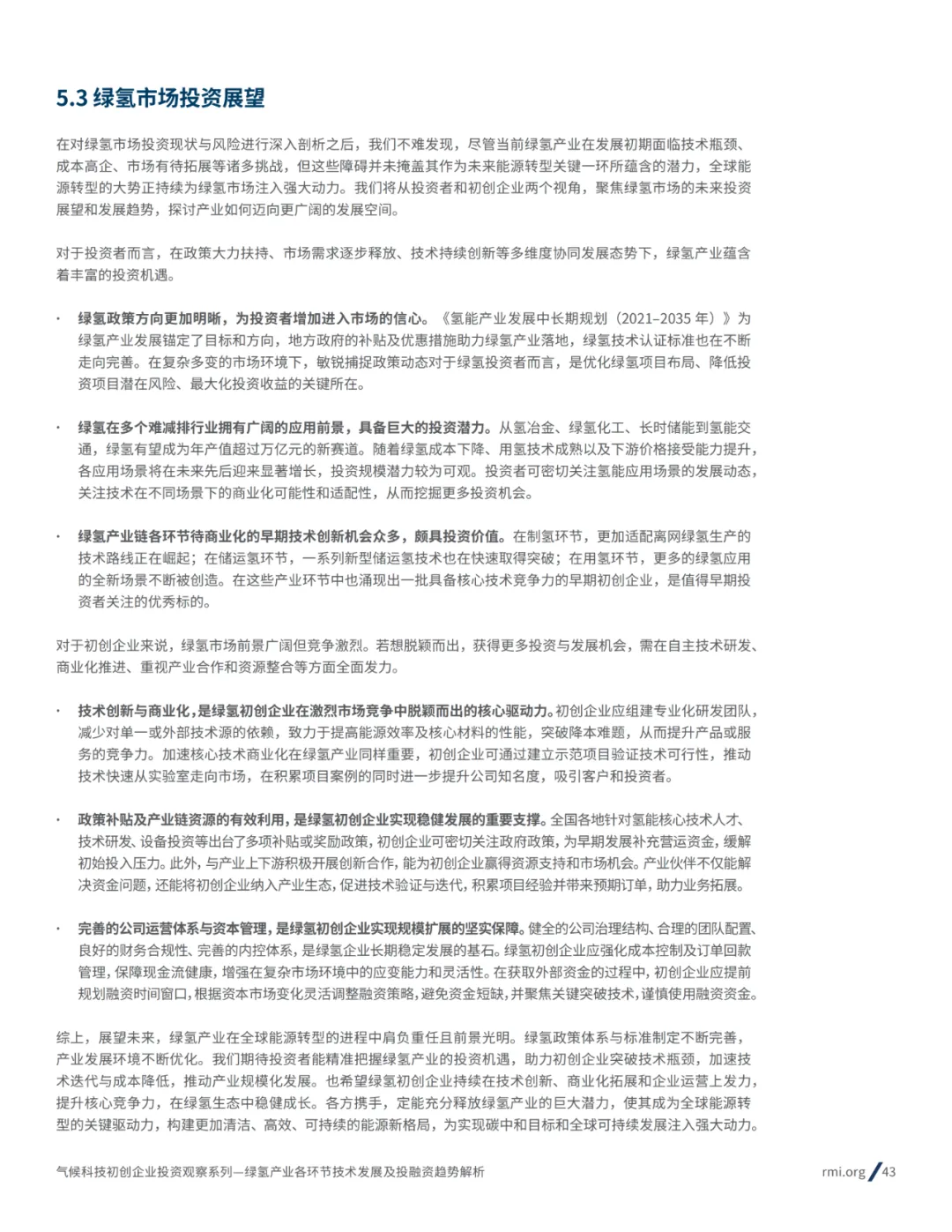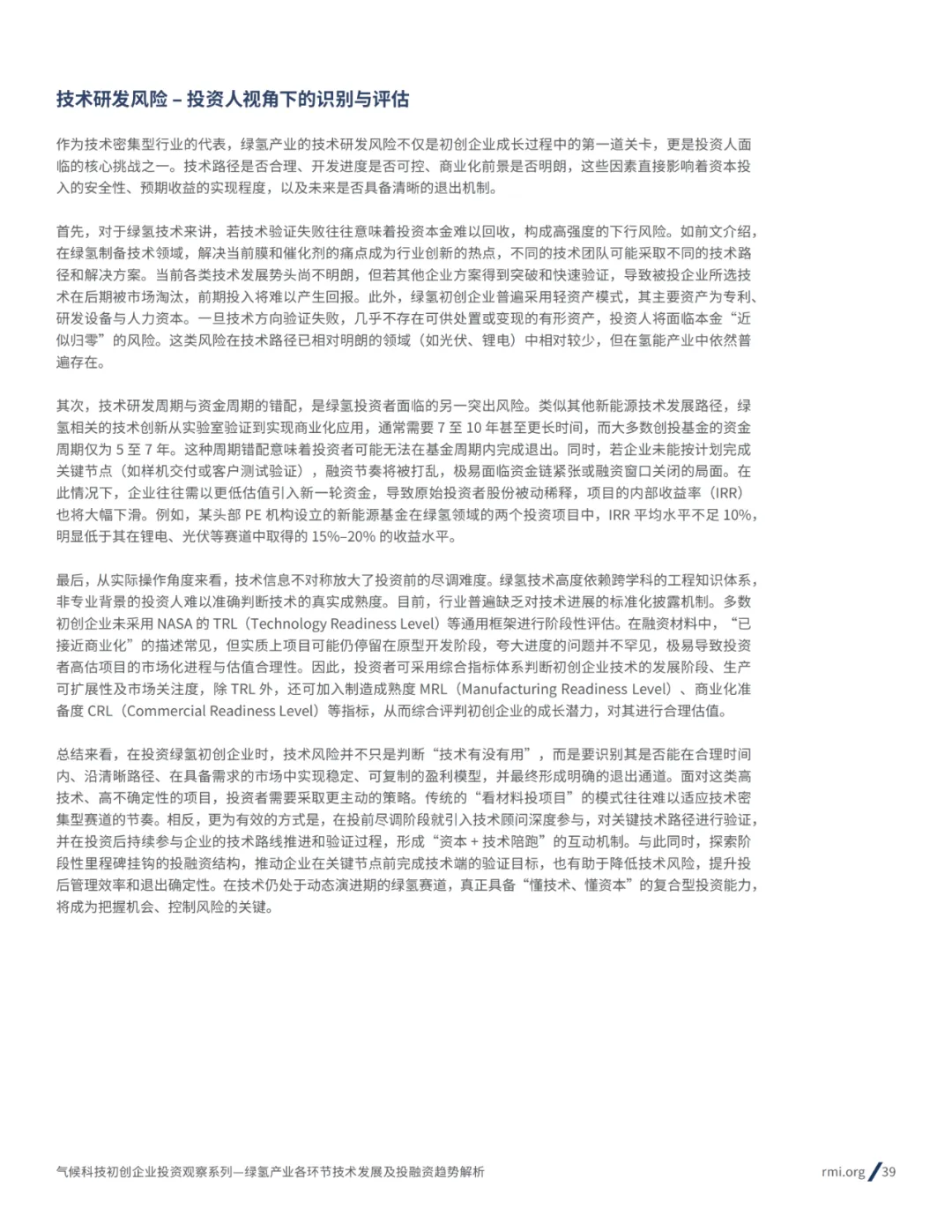 落基山研究所《绿氢产业各环节技术发展和投融资趋势分析报告》旨在全面梳理绿氢市场的发展现状、核心技术路径及投融资趋势,帮助投资者深入理解行业动态,降低投资门槛,力争实现资本对绿氢市场的技术突破和规模化发展的有效助力。本报告主要涵盖以下三个方面: