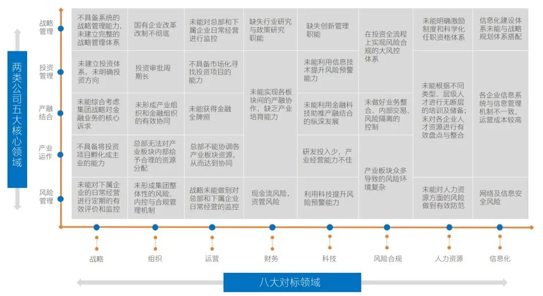 两类公司虽然在功能定位、管控模式、设立目标及发展方式上有所区别,但在经营管理上都注重战略管理、投资管理、产融结合、产业运作和风险管理五大核心领域。我们可从两类公司五大核心领域以及本次八大重点对标领域两个维度来分析两类公司在经营方面存在的普遍性问题: