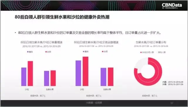 而80后更在意吃得健康,追求健康均衡的饮食。杂粮成为他们健康食品中偏好最高的食物;新鲜水果和沙拉颇受80后小白领的喜爱,他们在选择外卖商户时,也更偏爱品质商家。