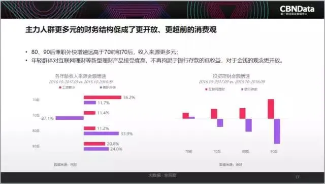 此外,CBNData《报告》显示作为消费升级的主力, 80后和90后不仅消费潜力不容小觑,根据挖财数据,收入来源也更多元。相对其他年龄群体,他们更愿意接受互联网理财等新型理财方式和产品,投资理财金额增速更高。花式挣钱花式买,在消费升级的大趋势下,年轻一代人的金钱观和消费观同步升级。