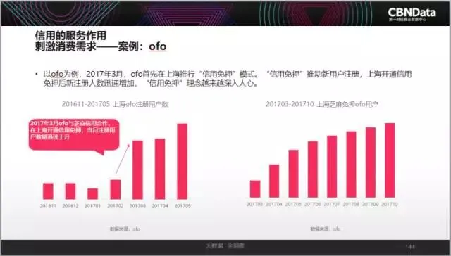 以共享单车为例,与2016年1月相比,2017年4月共享单车行业信用渗透率在10%以上的城市从2个上升到19个,信用渗透率在1%以下的城市从259个下降到57个,信用渗透率显著提升。来自ofo小黄车的数据也显示,免押金政策给小黄车的用户粘性和新客增长带来了有效增益。