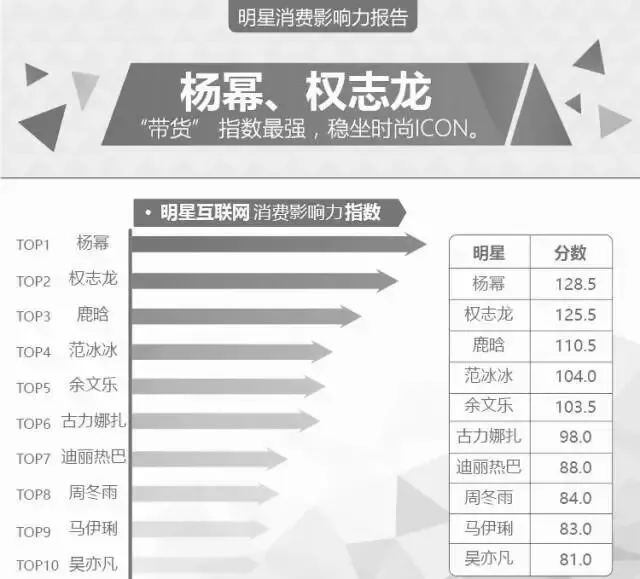 结果显示,杨幂综合得分最高,“带货女王”称号实至名归。紧随其后的的明星分别是权志龙、鹿晗、范冰冰、余文乐、古力娜扎、迪丽热巴、周冬雨、马伊琍和吴亦凡。