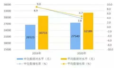 根据国家统计局数据,2020年,全国居民人均可支配收入32189元,比上年名义增长4.7%,扣除价格因素,实际增长2.1%。