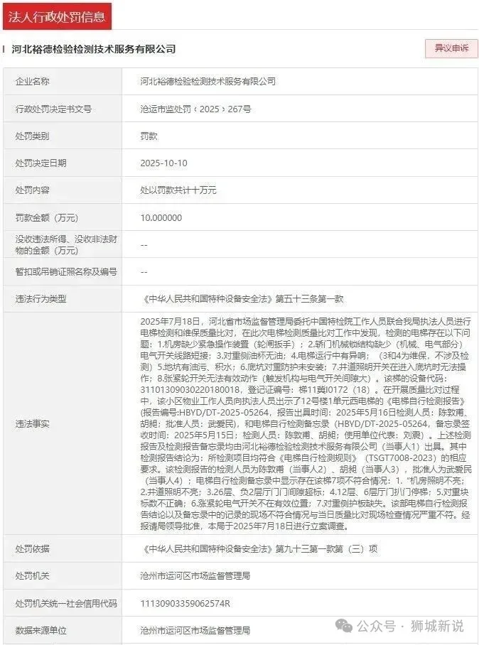 近日,信用河北网站发布了沧州市运河区市场监督管理局于10月10日作出的“沧运市监处罚﹝2025﹞267号”行政处罚决定书。