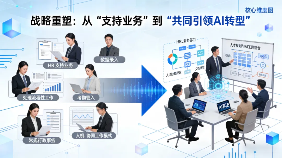 HR的新角色:组织AI转型的“共同架构师”。HR必须与IT、业务部门并肩,共同设计人机协同的新工作模式。这意味着HR要深入AI战略的核心,确保技术部署与人才规划、技能发展和组织文化变革同步。例如,在引入AI招聘工具时,HR需同步设计人机协作的面试流程、对面试官的AI辅助决策培训,以及相关的伦理审查机制。