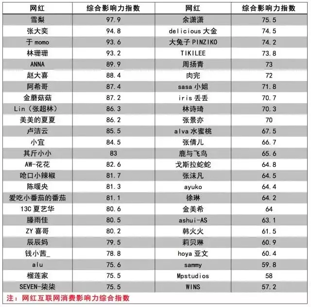 网红消费影响力指数综合排名
