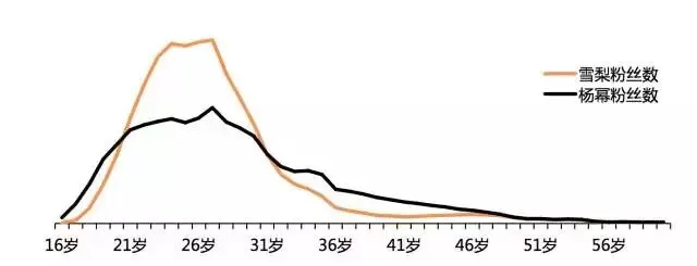雪梨的粉丝集中于20-30岁,杨幂的粉丝年龄分布相对较平均,从高中生到妈妈,都有他们的身影。