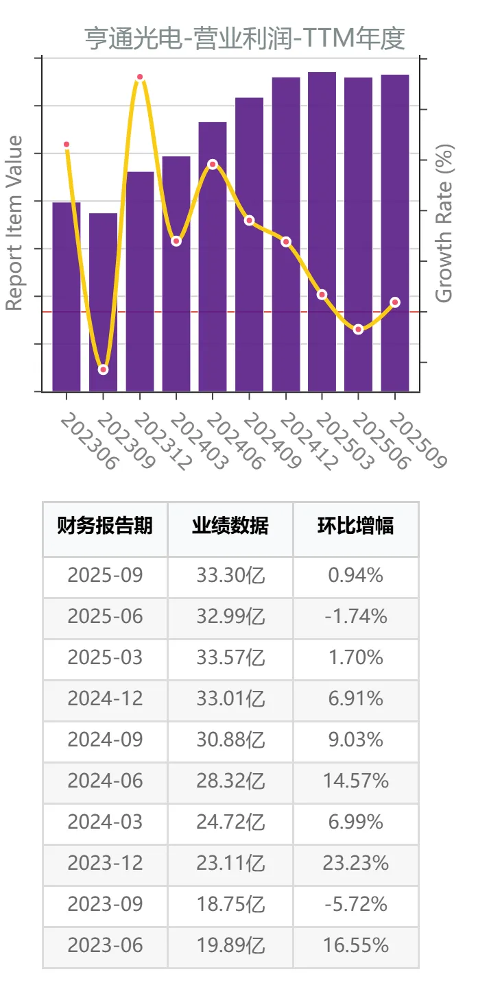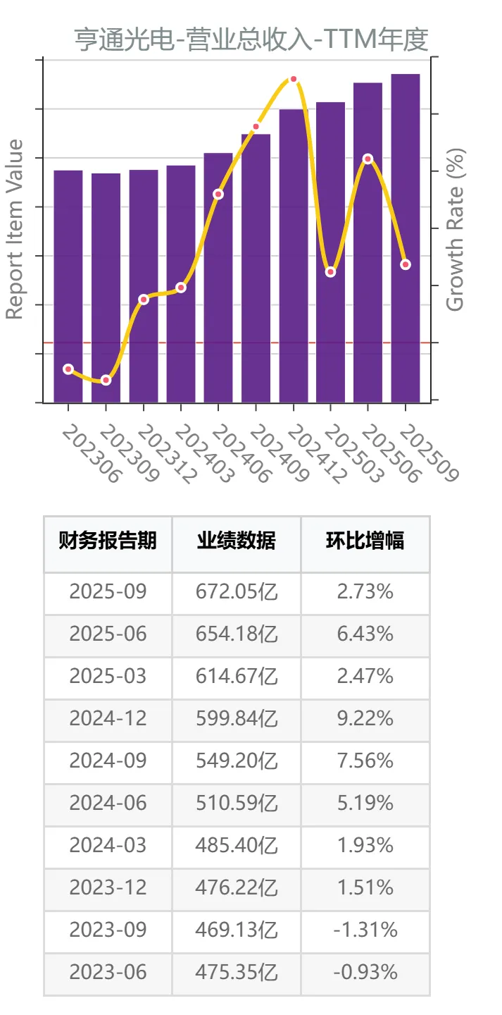 数据显示,亨通光电的TTM口径营业总收入已经连续八个报告期实现增长。但2025年以来,增幅有所放缓。
