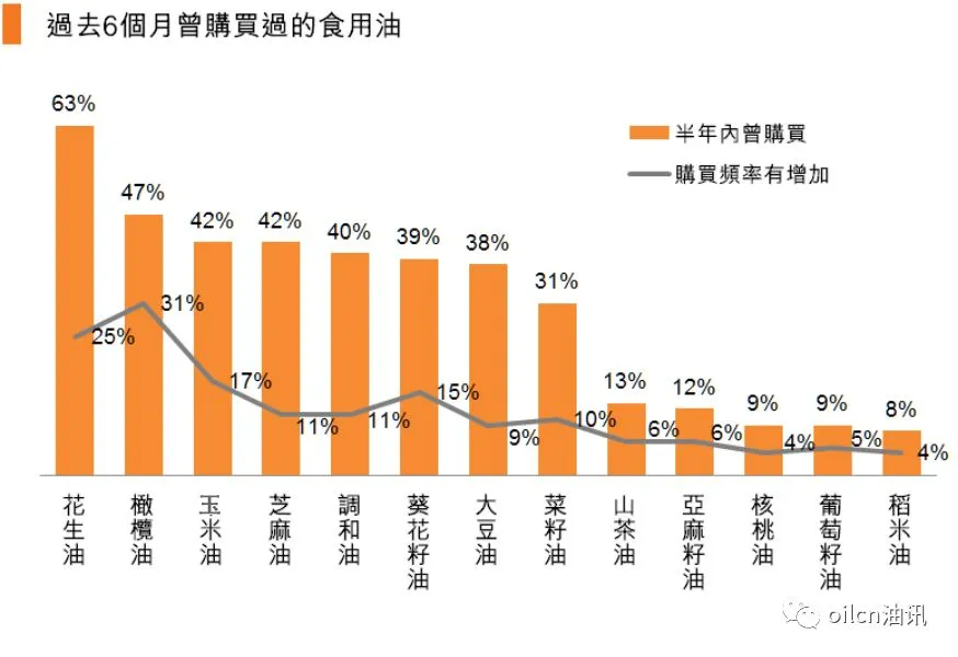 调查显示,受访者过去6个月平均购买过3.95种食用油,消费者因不同目的而用不同种类的食用油,而认为橄榄油的购买频率有增加 (相对2至3年前而言) 的比例较其他油品高。