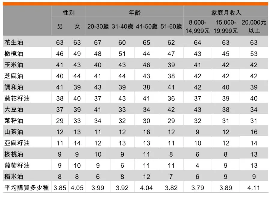 高收入受访者相对更多购买橄榄油、山茶油、核桃油、葡萄籽油等较贵价的油品,中等收入受访者则相对更多购买大豆油。
