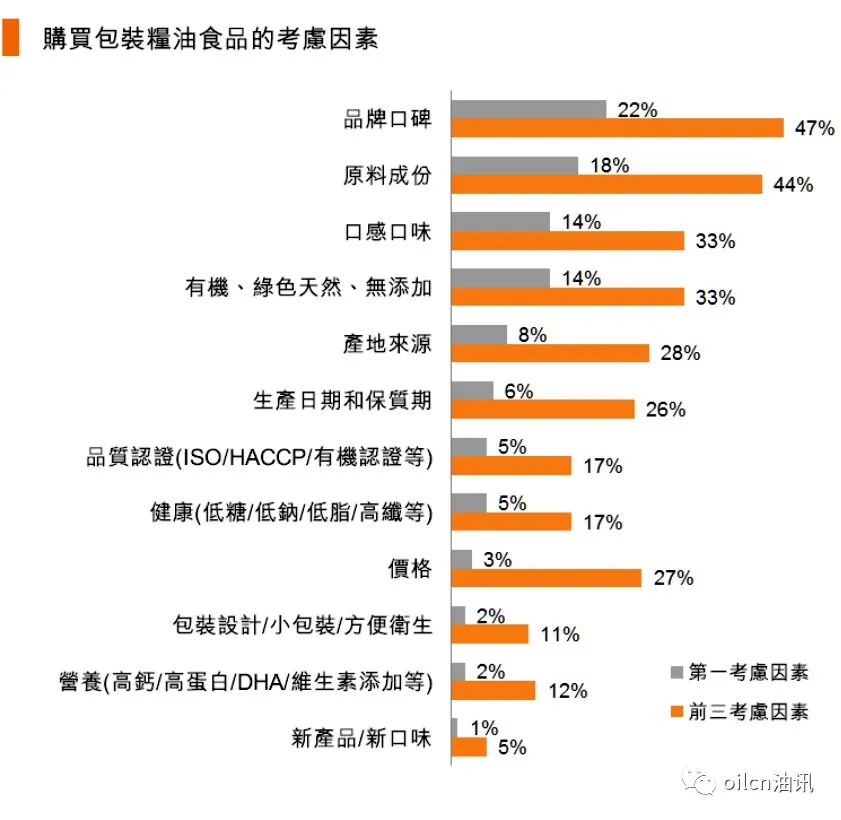 调查显示,品牌口碑、原料成份、口感口味、有机/绿色天然/无添加等,是购买粮油/干货时前3个主要考虑因素。