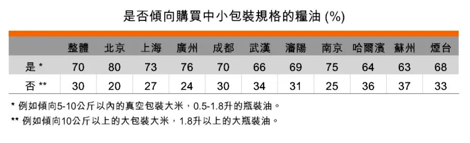 调查显示81%受访者认同“比起性价比更高的大包装,我更喜欢购买含独立包装的小包装产品,更精致,更卫生”,这种普遍趋势在粮油食品也得到印证,有70%受访者认同更倾向购买中小包装规格的日常食用粮油产品,例如5-10公斤以内的真空包装大米,0.5-1.8公升的瓶装油,当中一线城市似乎更有这趋势。