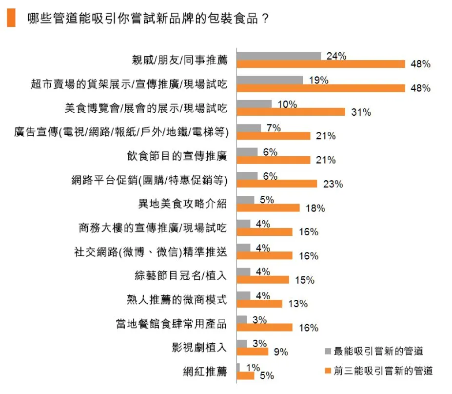 在问及哪些渠道能吸引消费者尝试新品牌的包装食品,最能吸引消费者尝新的前三管道包括熟人推荐、卖场推广、美食博览会等。